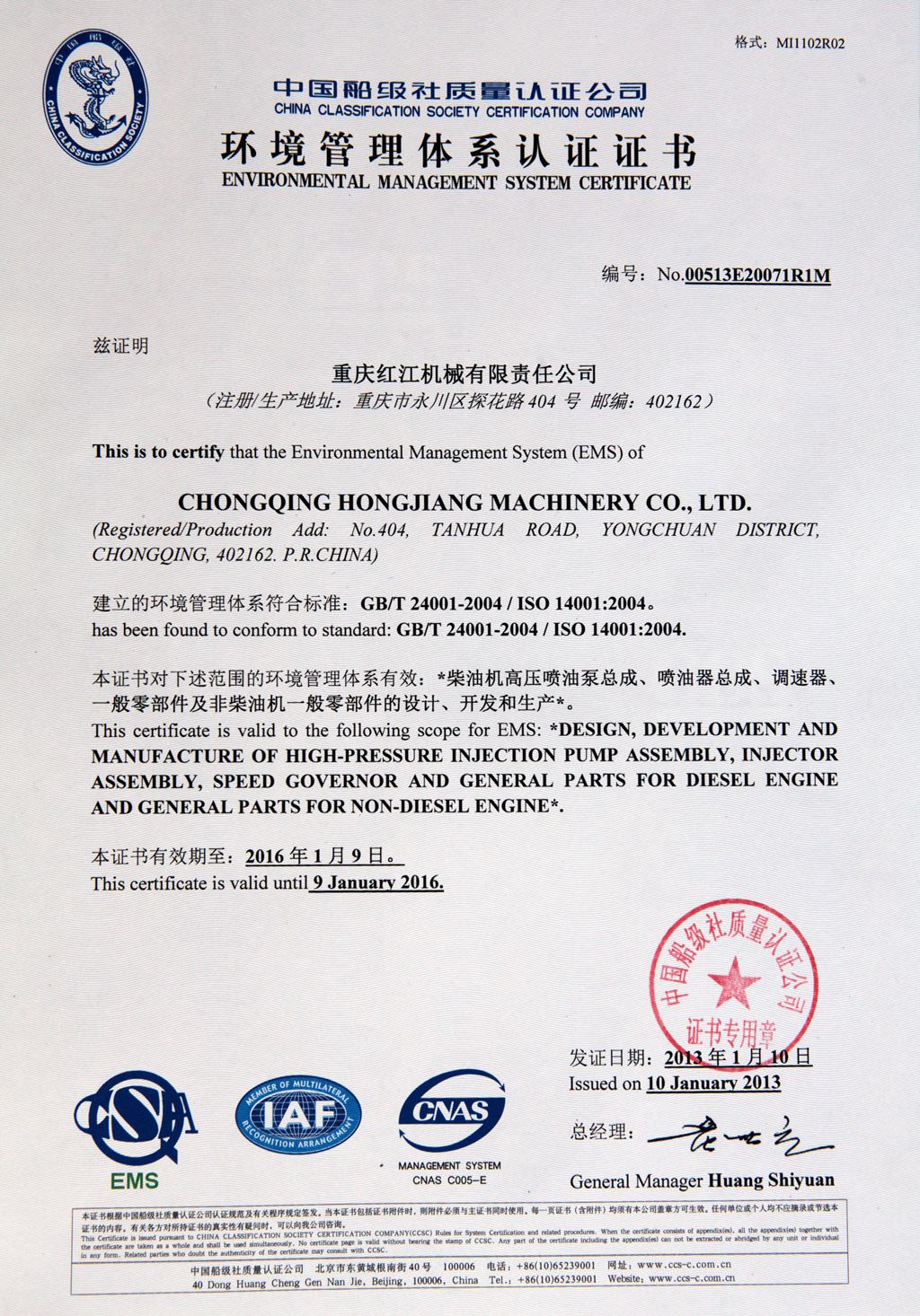 環(huán)境管理體系認(rèn)證證書