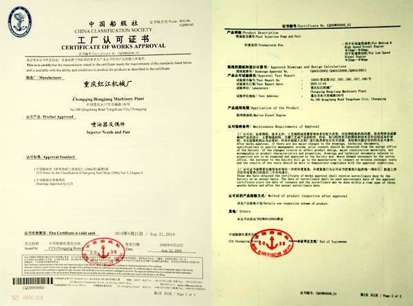 中國船級(jí)社認(rèn)可證書——噴油器及偶件